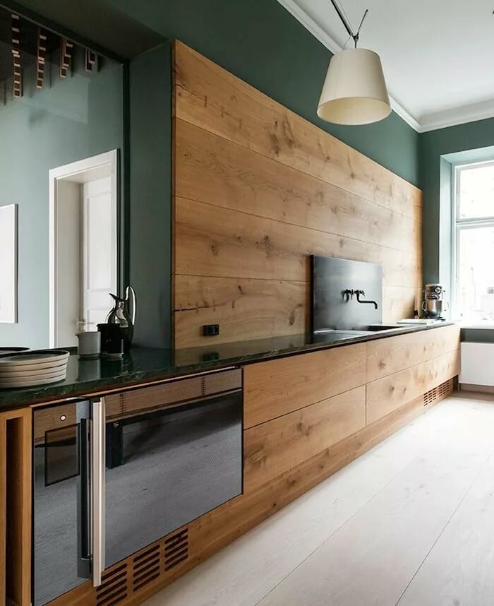 Кухонный гарнитур из натурального дерева выглядит стильно и экологично, подчёркивая связь с природой.