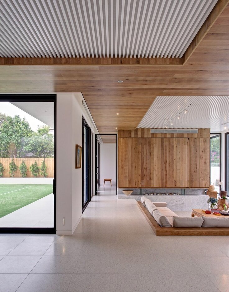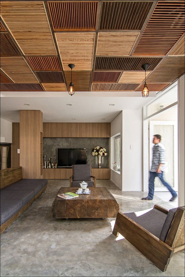 Современная гостиная, в которой дерево гармонично сочетается с бетонными и стеклянными поверхностями, создавая сбалансированный дизайн.