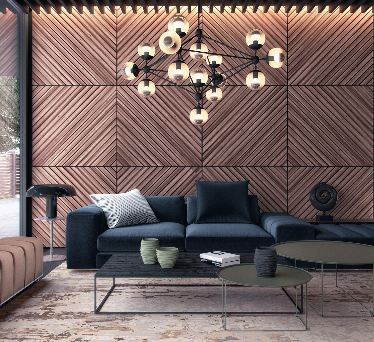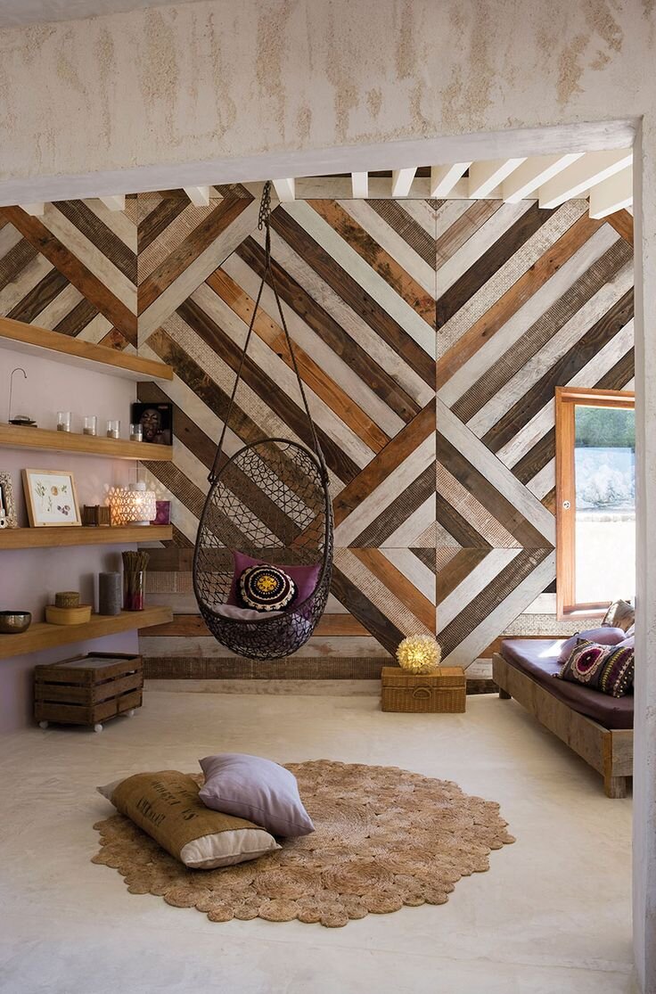 На фото представлен интерьер, где деревянные панели создают акцентную стену, добавляя глубины и фактуры комнате.
