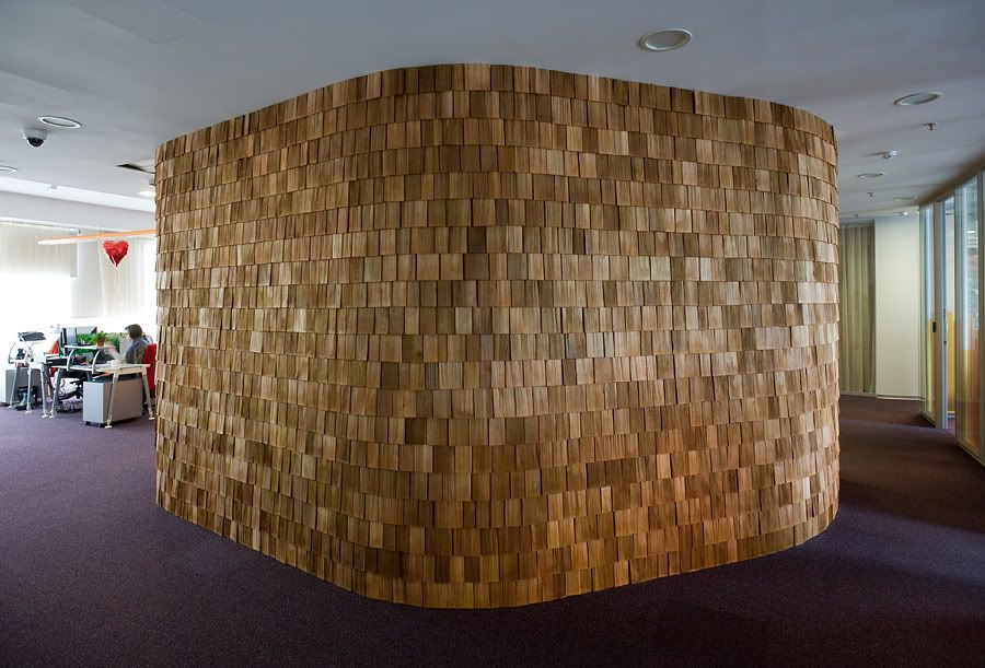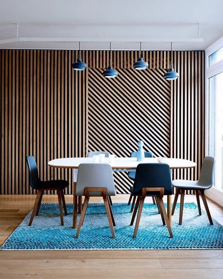 Выполнено из реек. Этот приём позволяет создавать динамичные и лёгкие акцентные поверхности, играя со светом и тенью.