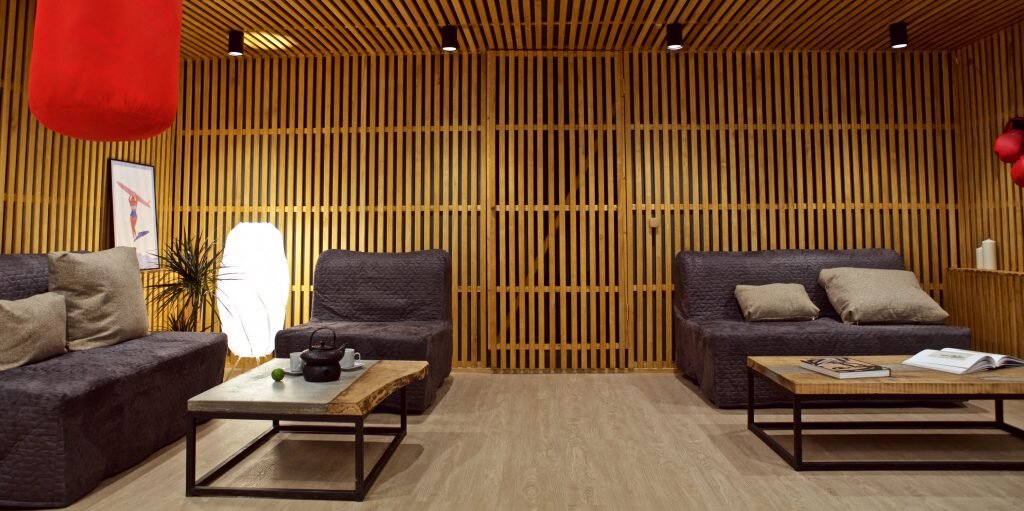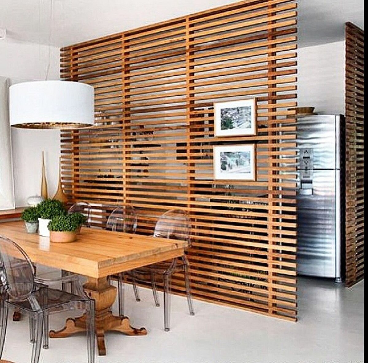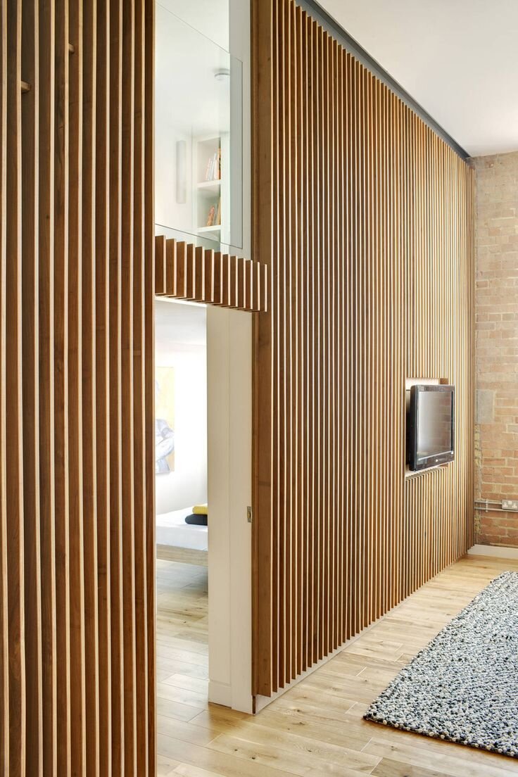 Деревянные перегородки — элегантный способ зонирования пространства без потери света и ощущения простора.
