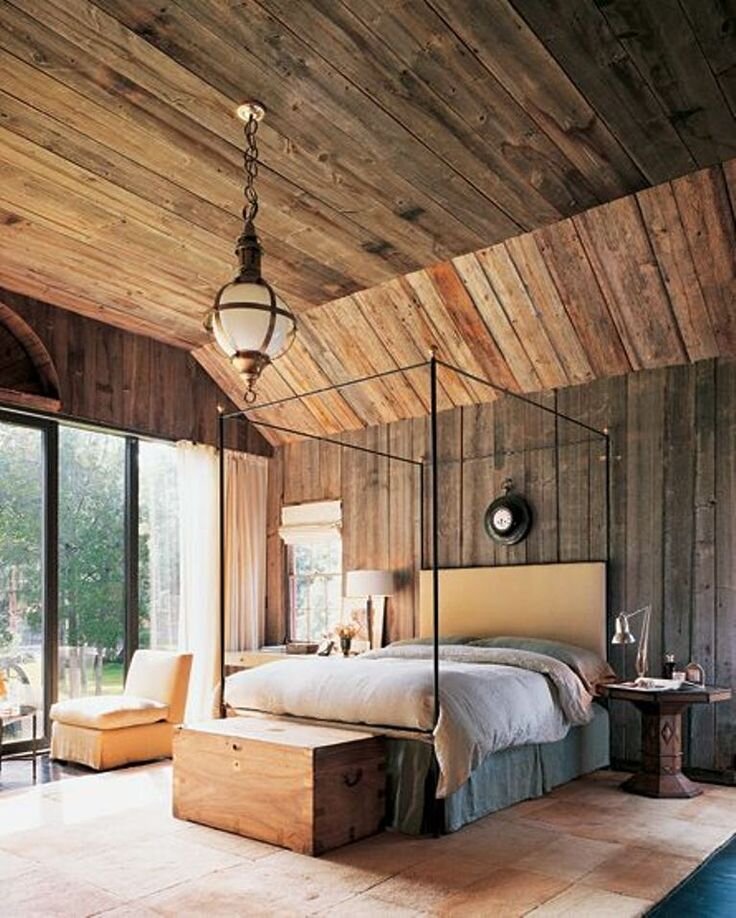 Деревянный потолок в спальне создаёт ощущение уюта и защищённости, идеально подходя для зоны отдыха.
