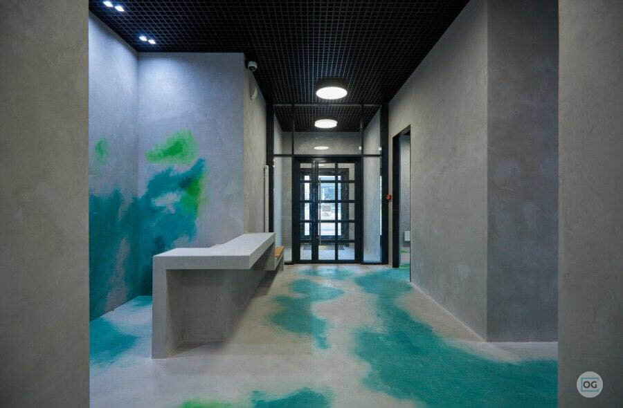 Дизайн интерьеров в ЖК «Кварталы 21/19» строится на принципах минимализма и индустриальной эстетики. Здесь нет лишних деталей — только строгие геометрические линии, открытый бетон и яркие цветовые акценты на стенах, напоминающие художественные мазки. Напольные покрытия имитируют водные поверхности: где-то это спокойный пруд, где-то — извилистый ручей, а в некоторых зонах создаётся эффект болотистой местности. Подобный подход к оформлению общественных пространств — настоящая новация для российского рынка недвижимости.