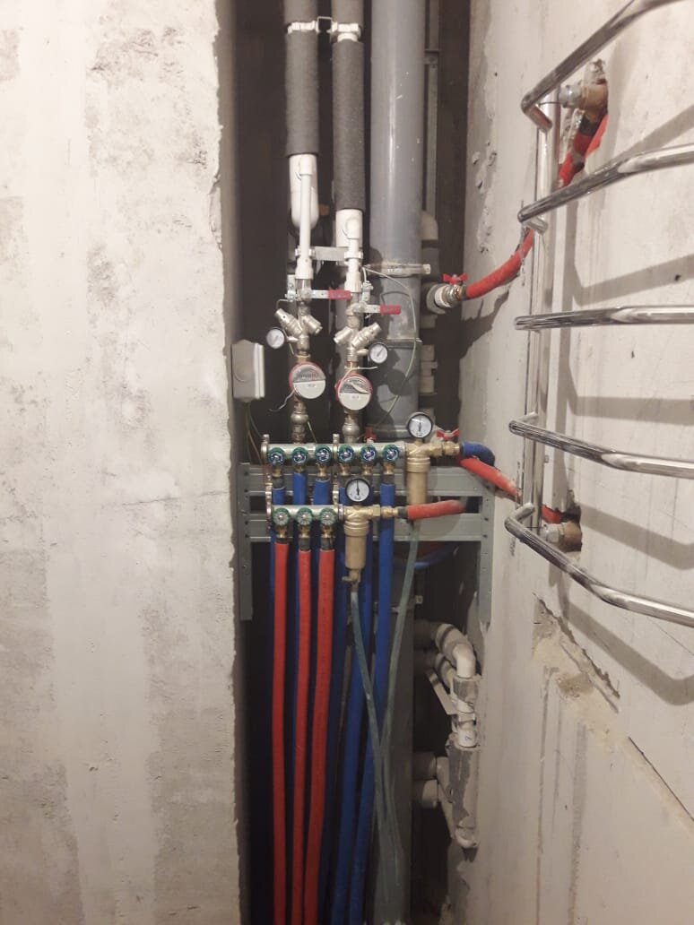 На фото: коллектор (гребенка) с отдельными вентилями для каждой точки.