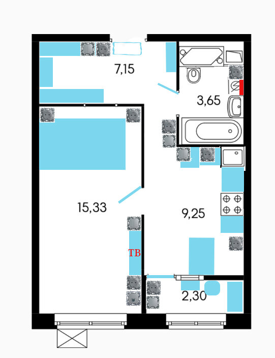 Параметры квартиры: кухня — 9.3 кв.м, комната — 15.3 кв.м, ванная — 3.6 кв.м, коридор — 7 кв.м, а также небольшая веранда (так она указана в плане) — 2.3 кв.м. Высота потолков — 2.75 метра.