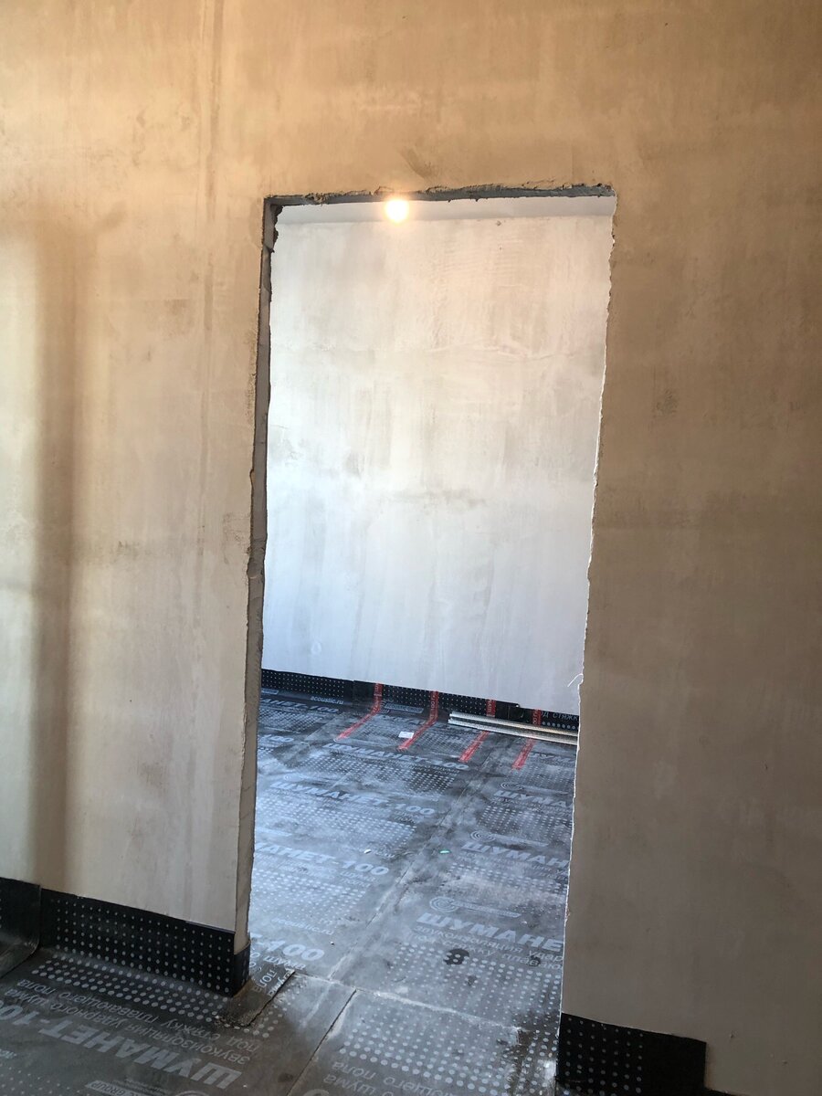 Следующим этапом была полусухая стяжка пола и оштукатуривание стен. По совету прораба мы добавили слой «Шуманет» для звукоизоляции, что незначительно увеличило стоимость, но улучшило комфорт. Стяжка «съела» около 6-7 см высоты, наибольший перепад был в коридоре.