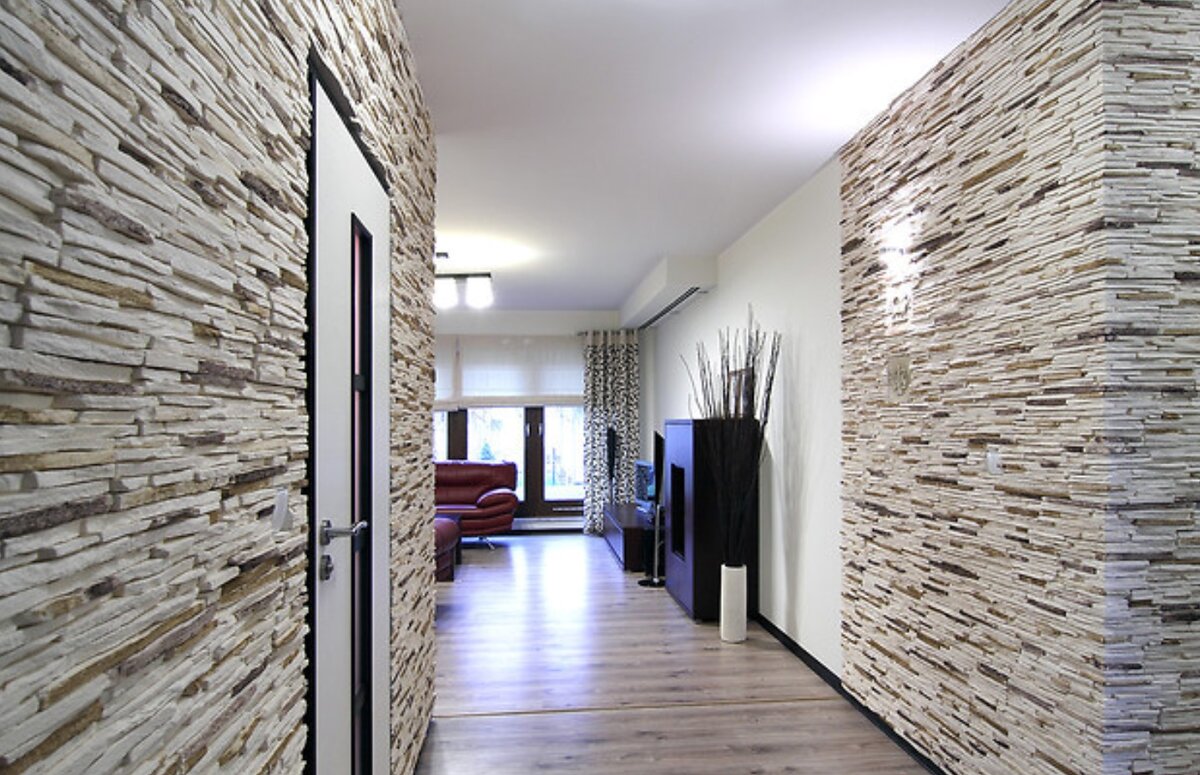 Это самый бюджетный и лёгкий вариант среди искусственных камней. Его часто используют для облицовки гипсокартонных перегородок, так как он не создаёт значительной нагрузки. Однако у гипса есть и недостатки: он хрупкий и сильно впитывает влагу, что может привести к разрушению. Поэтому, если вы планируете отделку прихожей гипсовым камнем, обязательно покройте его после укладки защитным акриловым лаком или специальной пропиткой.