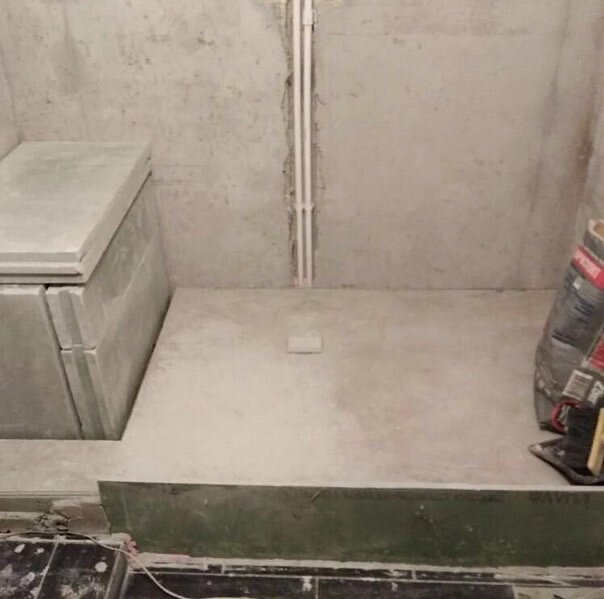 Работы начались с демонтажа старой ванны и подготовки пола. Чтобы организовать правильный уклон для стока, уровень пола был поднят с помощью утеплителя. На этом этапе проложили новые канализационные трубы и трубы для будущего душевого смесителя, тщательно спланировав их расположение.