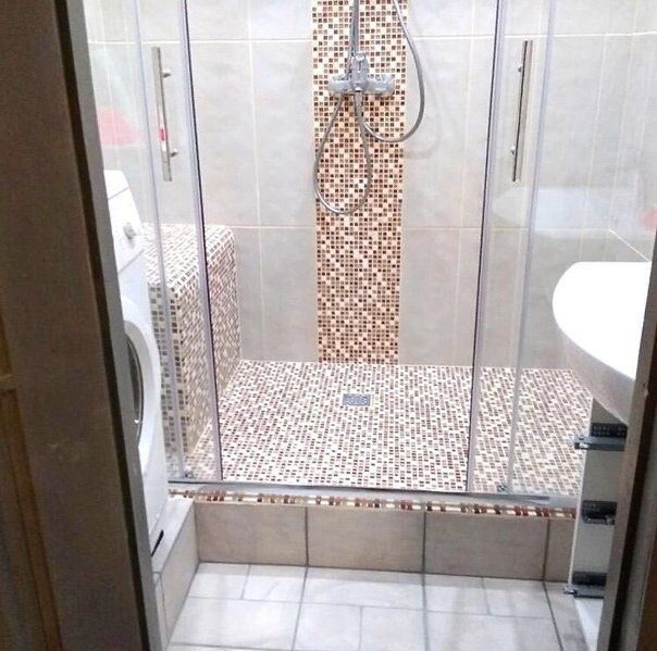 На завершающем этапе установили душевой смеситель и прозрачные стеклянные двери, визуально не перегружающие пространство. Для экономии места стиральную машину разместили на специально созданном подиуме.