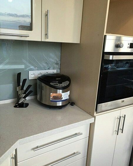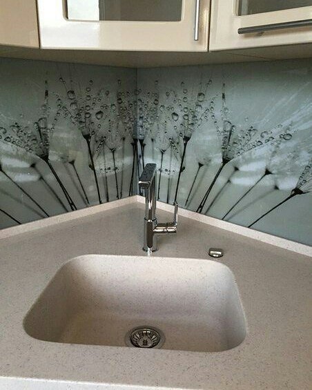 Мойка была интегрирована прямо в столешницу, что создает единую, бесшовную и гигиеничную поверхность. Для изготовления столешницы был выбран искусственный камень — современный и практичный материал. Его главные преимущества — влагостойкость и долговечность: такая поверхность не размокнет и не разбухнет от постоянного контакта с водой.