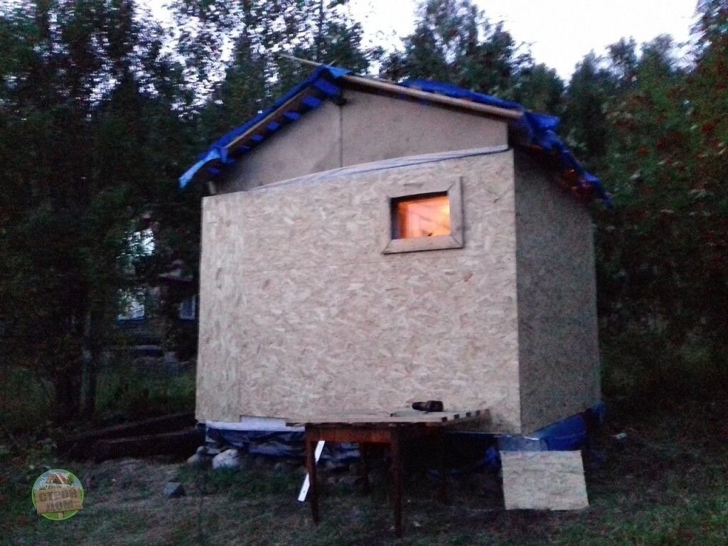 Снаружи строение обшили листами фанеры, смонтировали простую кровлю — и баня была готова. Ее внешний вид получился довольно аскетичным, но изначальной задачей была не красота, а функциональность и экономия.
