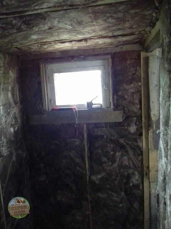 Понятно, что сами по себе поддоны — не лучший материал для сохранения тепла. Поэтому стены изнутри пришлось серьезно утеплять. Был уложен толстый слой минеральной ваты, который является эффективным теплоизолятором.