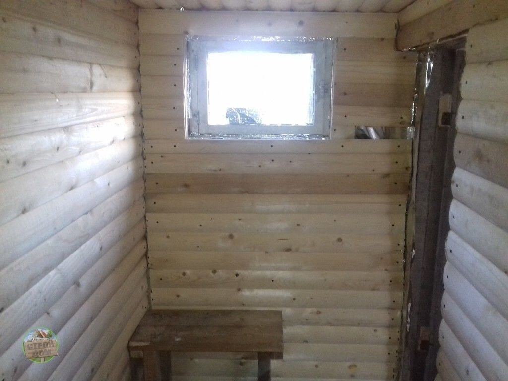 Несмотря на стремление к теплоизоляции, в стене предусмотрели небольшое окно. Оно служит и для естественного освещения, и для необходимой вентиляции парной.