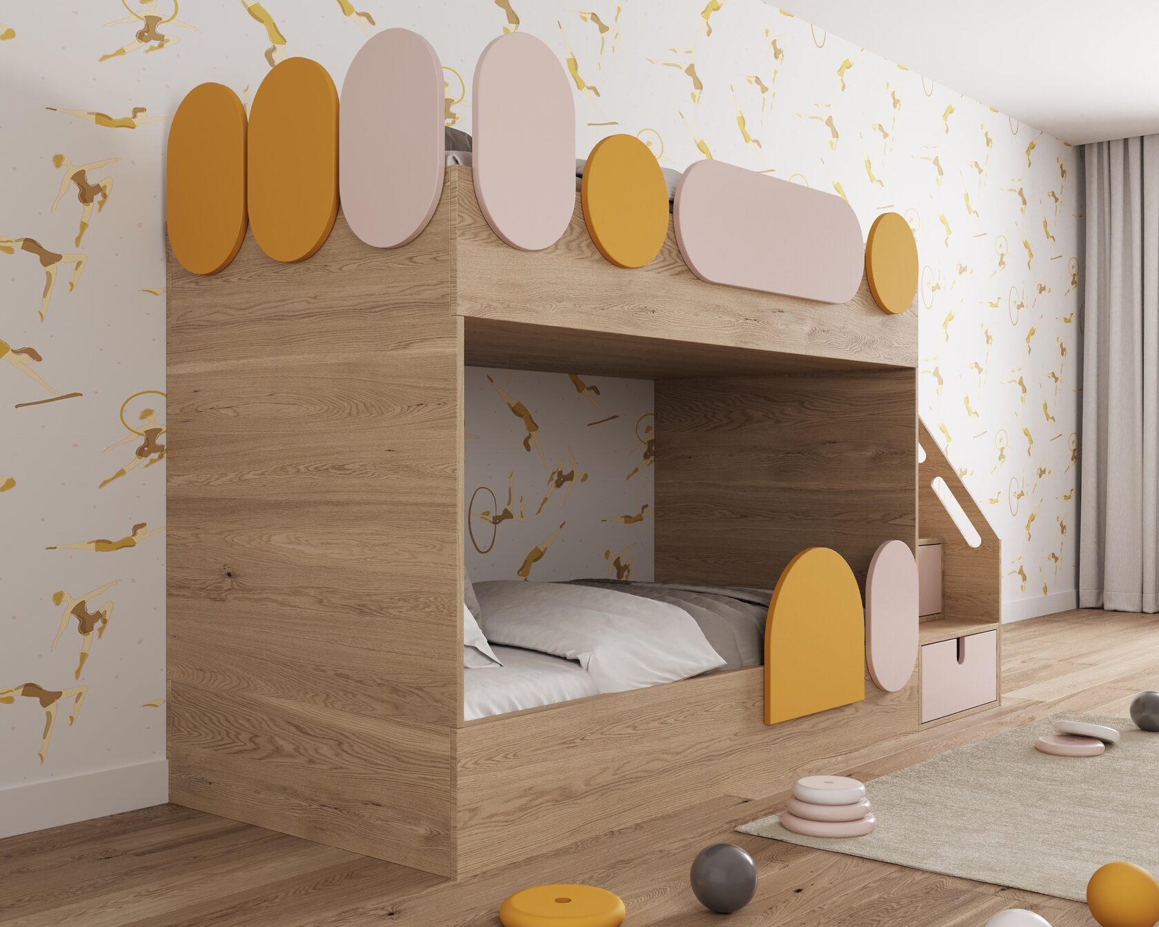 • Бортики для верхнего яруса: Обязательный элемент безопасности. Высота защитных бортиков должна быть не менее 25-35 см, чтобы предотвратить случайное падение ребенка во сне.