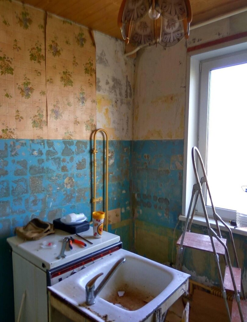 Ремонт начался с масштабной подготовки поверхностей. Первым делом мы полностью удалили старую советскую плитку, которая давно потеряла свой вид. Затем тщательно очистили стены от многослойных старых обоев и максимально счистили остатки прежней краски. Для создания идеально ровной основы стены были обработаны ротгипсом и профессионально отшлифованы, что обеспечило отличную адгезию для последующей отделки.