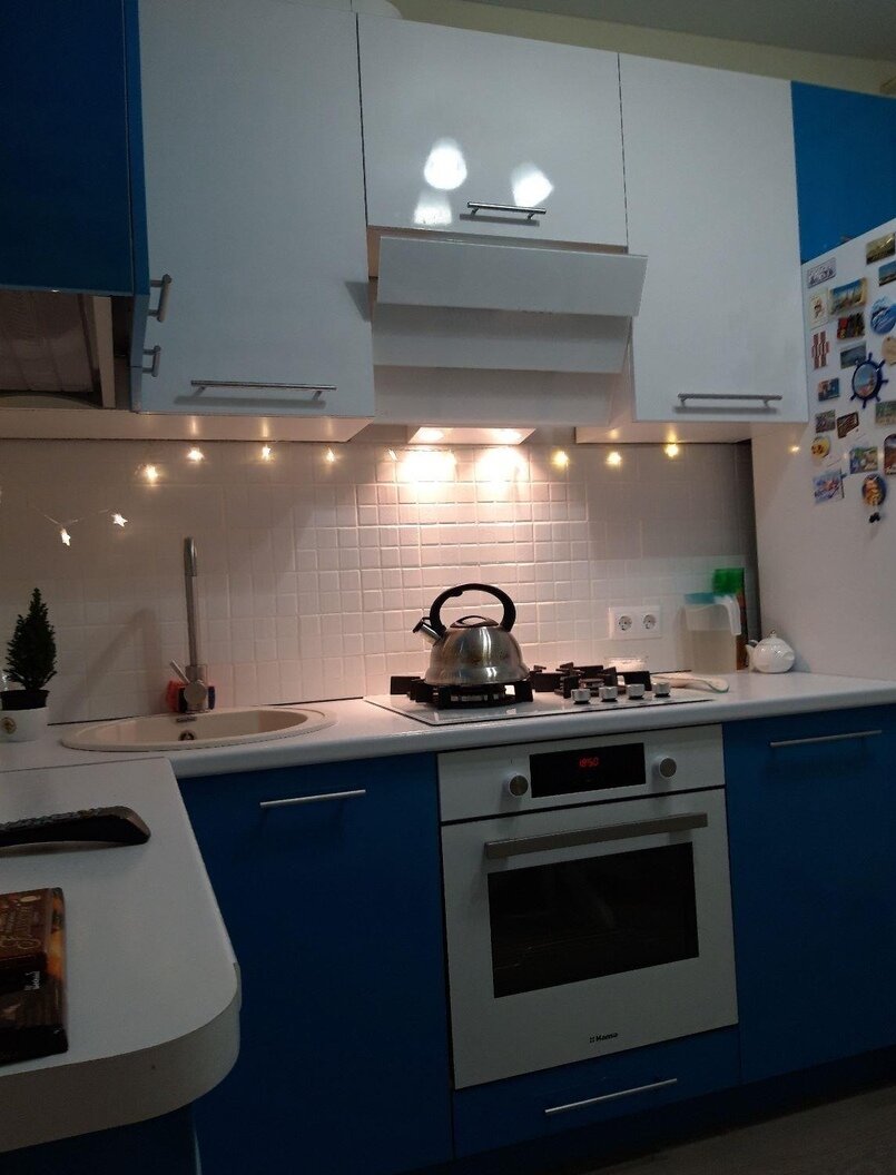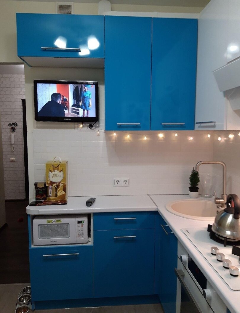 Воплощением выбранной концепции стал бело-голубой кухонный гарнитур. Его цветовое решение идеально вписалось в общую гамму и полностью соответствовало нашей задумке. Несмотря на кажущуюся простоту, гарнитур оказался очень функциональным и вместительным, предоставив достаточно места для хранения всей необходимой утвари.