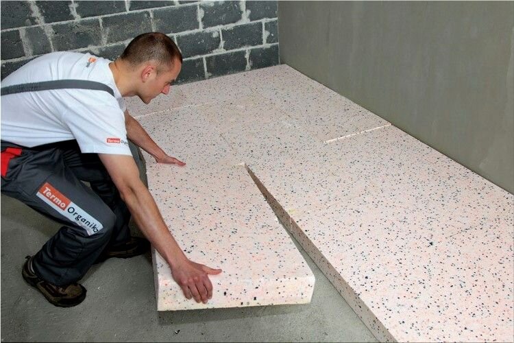 Также пенопласт хорошо подходит для утепления стяжки пола, выполненной из бетонного или самовыравнивающего раствора. Но в этом случае панели утеплителя укладывают сразу на черновую плиту перекрытия. Причем, чтобы добиться более качественной теплоизоляции, здесь лучше использовать пенопласт с пазо-гребневой системой. Утеплителем закладывают очищенную плиту перекрытия по всей площади, не оставляя щелей. Швы между плитами проклеивают монтажной лентой.