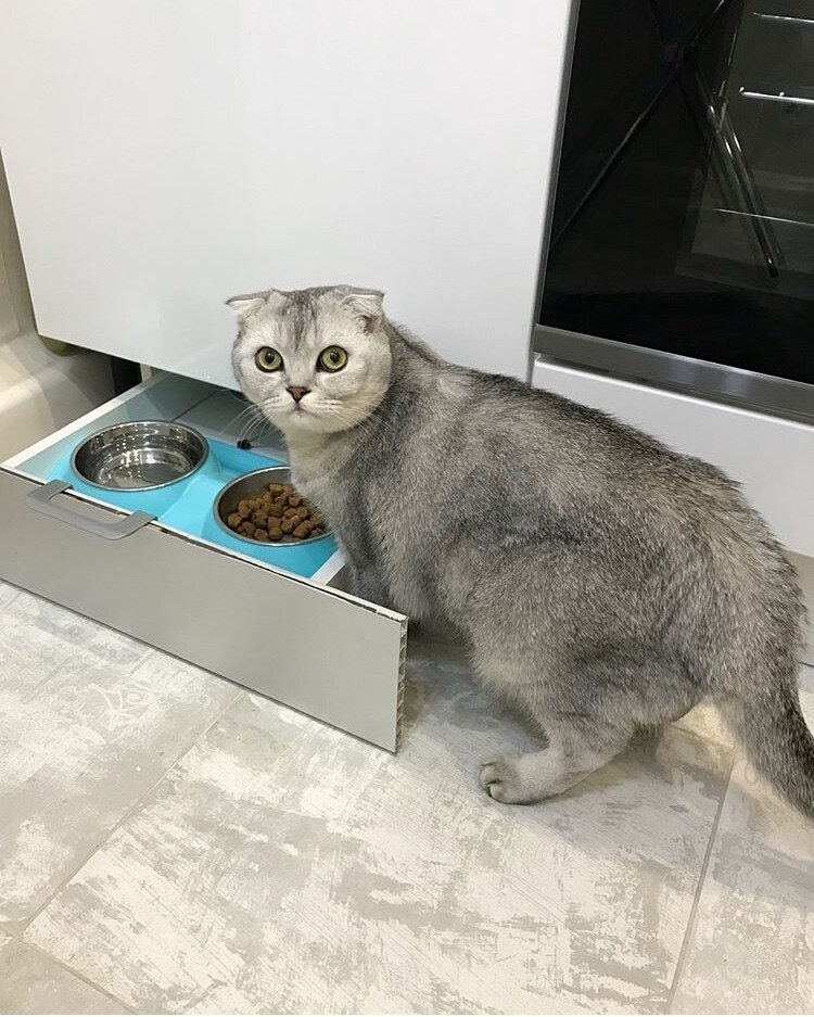 Отдельное внимание уделено комфорту домашнего любимца. Под встроенным холодильником организована специальная выдвижная панель-столик для кота. Это практичное решение позволяет содержать миски с едой и водой в одном месте, поддерживая порядок на кухне и обеспечивая питомцу его собственный, аккуратный уголок.