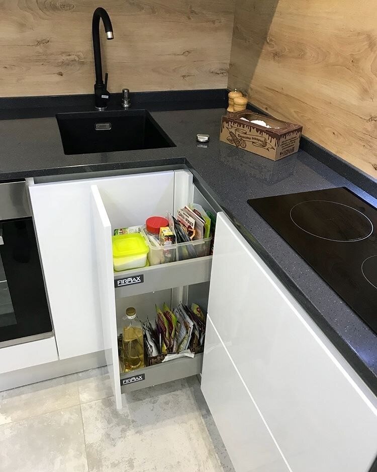 Для хранения кухонной утвари рядом с плитой предусмотрен узкий шкаф-карго шириной 30 см, что очень удобно для повседневного использования.