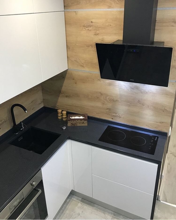 Компактность всей конструкции стала возможной благодаря узкой боковой стороне шириной всего 40 см. Индукционную варочную панель шириной 30 см установили поперек, что также экономит место. Дизайнерский акцент — стеновая панель, уложенная вразбежку. Этот прием не только визуально интересен, но и придает интерьеру более дорогой и продуманный вид.