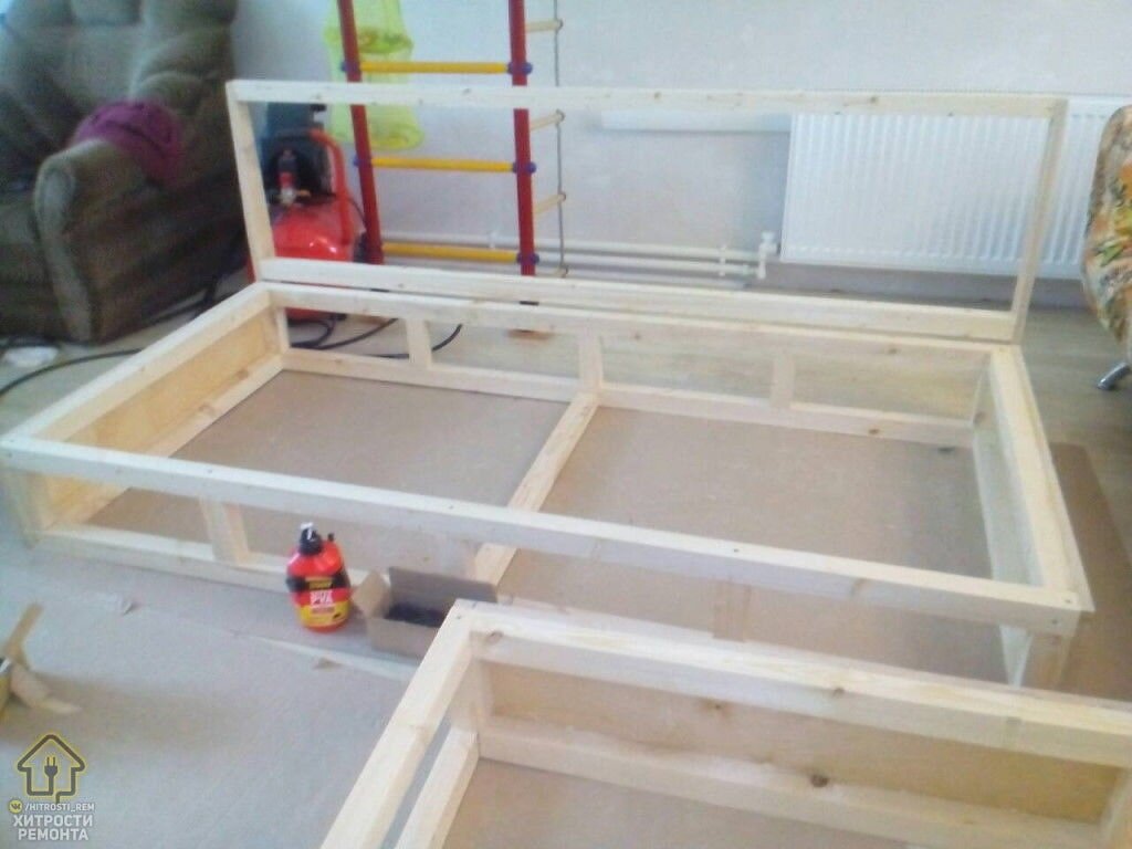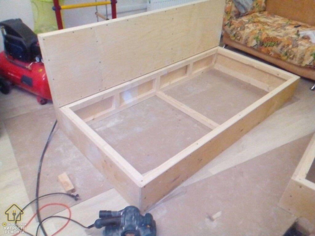 Для создания надежного основания каркас был обшит толстой фанерой. Этот шаг не только добавил жесткости всей конструкции, но и создал идеально ровную поверхность для последующей обивки.
