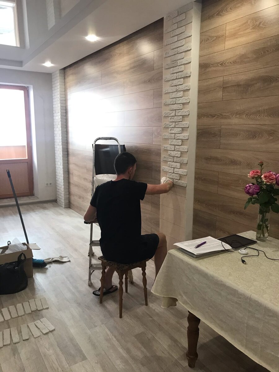 У меня зачастую получалось, что наклеенная плитка по своим краям имела небольшую щель со стеной. Чтобы с любого ракурса плитка казалась цельной, как будто это кирпич, я замазывал эти стыки тем же самым клеем с помощью малярной кисточки.