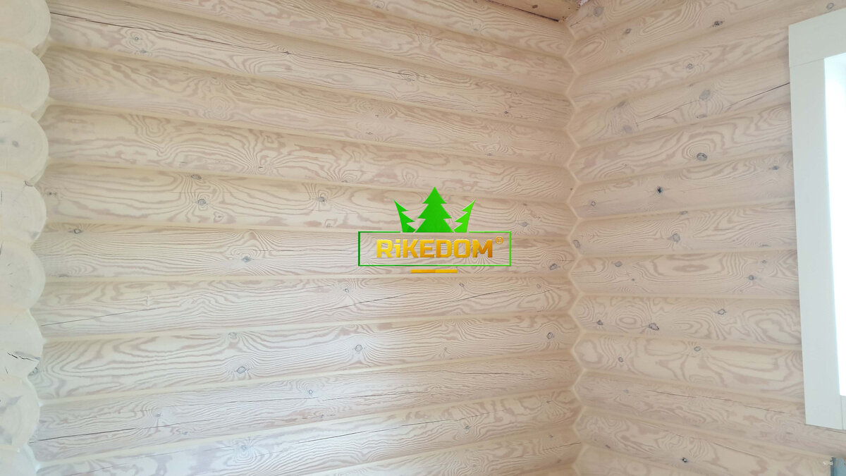 Вид внутренних стен сруба после первого этапа отделки (грунтовка и один слой краски).