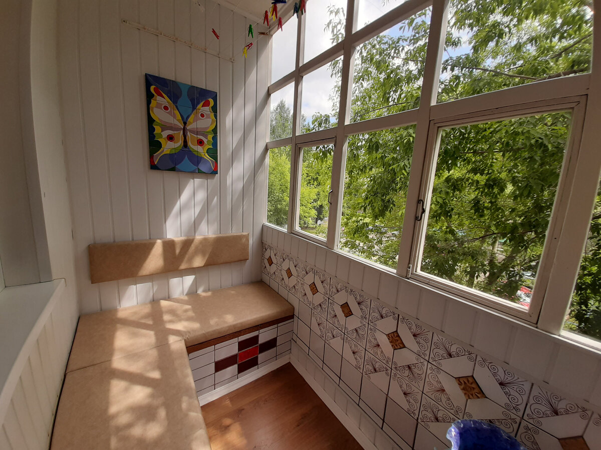 Чтобы лоджия стала местом для комфортного времяпрепровождения, нужны удобные сиденья. Их можно сделать с подъёмными крышками, организовав под ними дополнительное пространство для хранения. Туда отлично поместится сезонная кухонная утварь, посуда, которой редко пользуются, или небольшой запас нескоропортящихся продуктов, освобождая драгоценные метры на кухне.