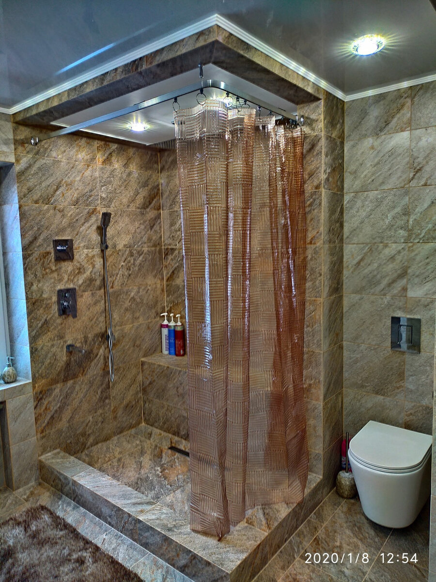 Внутри санузла всё выполнено на высоком уровне. Особенно выделяется просторная душевая зона, которую, как и многое другое, сделали своими руками. Комплектацию дополняют стильный подвесной унитаз и удобная раковина.