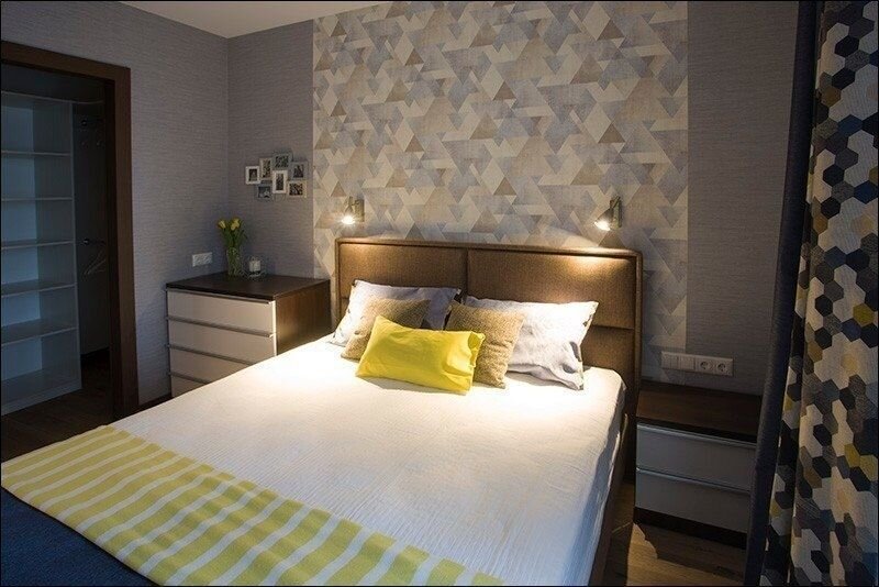 Отдельная спальня стала тихим и уютным уголком для отдыха. Учитывая, что в квартире не слишком много естественного света, в отделке сделали акцент на теплые, глубокие оттенки, которые создают атмосферу умиротворения.