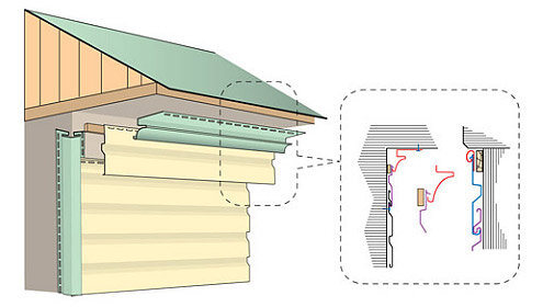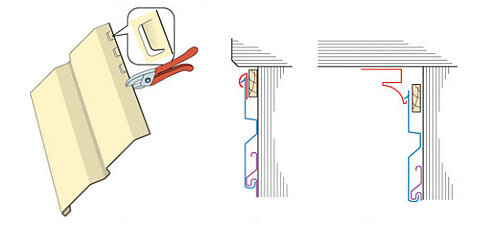 Данный элемент конструкции предназначен для установки под карнизами, а также на выступающих оконных и дверных проемах. Его установку проводят параллельно с J-профилем. В данном случае край панели устанавливается в один из разрезов и таким образом, надежно фиксируется.