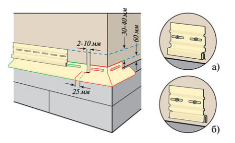 После проведения данных разметок можно приступать к установке стартового профиля. Если цоколь дома выступает, в конструкции сайдинга предусмотрена установка специальных отливов. Монтаж данных элементов начинается от угла с необходимым подрезанием по предварительно изготовленному шаблону. Отлив крепится с нахлестом в 25 мм. При этом необходимо выполнять подрезание планок для закрепления.
