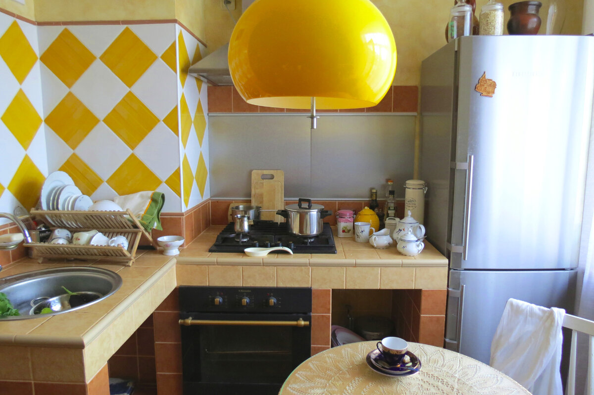 Подсказка пришла из воспоминаний о поездках по Средиземноморью, где керамическую плитку используют нетрадиционно. Нижний ярус с рабочей поверхностью я заменила конструкцией из гипсокартона, облицованной плиткой терракотового и песочного оттенков. В ней предусмотрены ниши для техники и утвари. Мастера-плиточники удивлялись, но воплотили замысел. Стену у мойки защитил «фартук» из глянцевой плитки белого и ярко-жёлтого цвета — он задал настроение всей кухне.