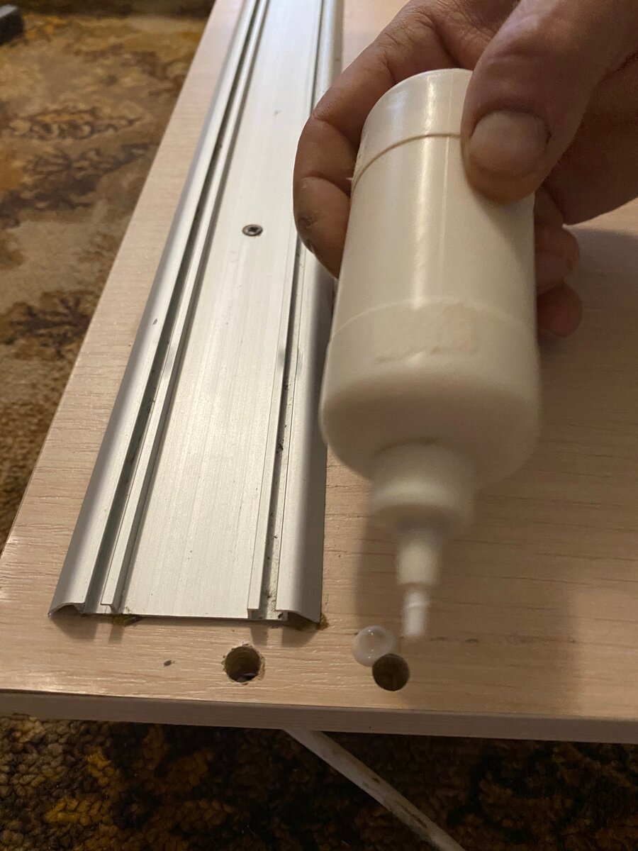 Осталось вставить двери. Для это по верху и низу шкафа необходимо прикрутить профильные полозья для хода дверей-купе.
