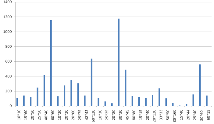 На диаграмме по горизонтали отмечены размеры плиток, а по вертикали – количество доступных предложений. Исследование, проведенное в октябре 2020 года, выявило явных лидеров: