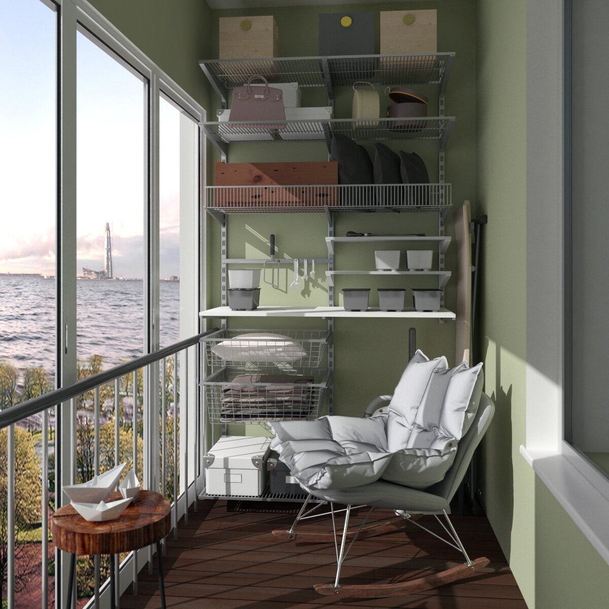 Если в основных комнатах не хватает места для приема гостей, балкон может стать отличной мини-гостиной. Чтобы не терять полезный объем, выбирайте мебель с дополнительными функциями. Например, кресла или компактные диваны со встроенными выдвижными ящиками или отсеками под сиденьями. В них удобно хранить инструменты, сезонные аксессуары, книги или даже домашние заготовки. Такой подход позволяет убить двух зайцев: создать комфортное место для релаксации и решить вопрос хранения множества мелочей. Для организации остальных вещей идеально подойдет модульная система хранения, например, шведская система Elfa, которая адаптируется под любые нужды и конфигурации помещения.
