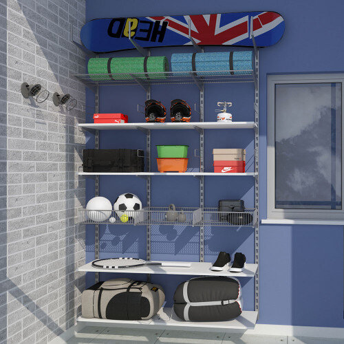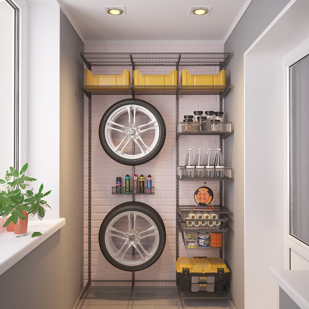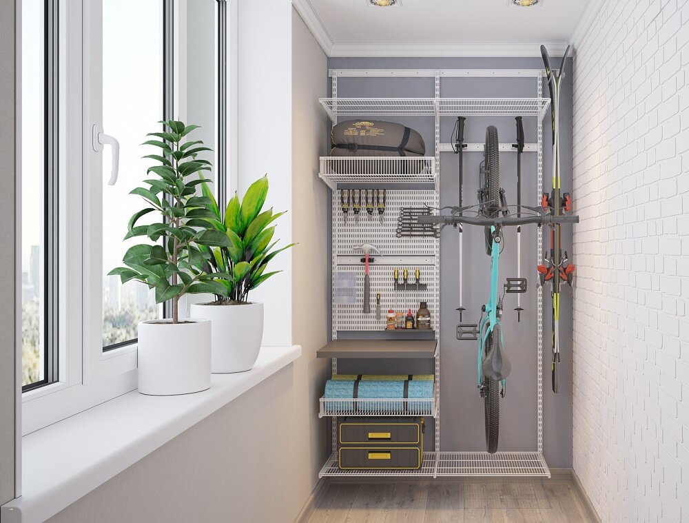 Хранить крупные предметы вроде велосипедов, лыж, сноубордов или запасных колес в прихожей — неудобно и непрактично. Балкон же для этого подходит идеально. Специальные системы хранения, такие как сетчатые панели Elfa, позволяют рационально использовать вертикальное пространство и стены. С помощью крючков, полок, креплений и боксов можно аккуратно разместить весь спортинвентарь, освободив жилые комнаты от громоздких предметов. Это не только экономит место, но и сохраняет вещи в порядке, обеспечивая к ним легкий доступ.