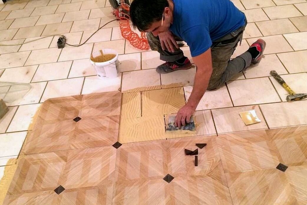 Для укладки щитового паркета необходима ровная бетонная стяжка или лаги. Если имеет место второй вариант, то лаги должны состоять из твердолиственных сортов деревьев. Перед укладкой щитовая планка раскладывается по комнате для определения оптимального положения, после этого профессионал натягивает маячные шнуры по срезу кромки щита.