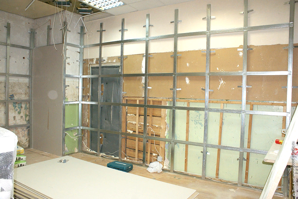 Монтаж на каркас. Это самый радикальный и эффективный метод, который позволяет справиться с любыми, даже самыми критичными перепадами, превышающими 5 сантиметров. На стену монтируется обрешётка из металлических профилей, к которой крепятся листы ГКЛ. Главное преимущество этого способа — образовавшееся пространство между стеной и гипсокартоном можно заполнить утеплителем или шумоизоляционным материалом, значительно улучшив комфорт в помещении. Недостаток — каркас «съедает» полезную площадь, что важно учитывать в небольших комнатах.
