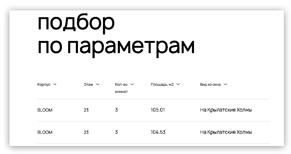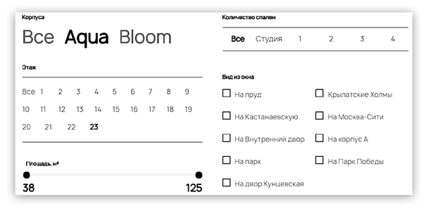На официальном сайте Shome представлен удобный инструмент для подбора квартиры. Вы можете задать нужные параметры: корпус, площадь, этаж, количество комнат и даже предпочтительный вид из окна. После этого доступен визуальный просмотр планировок в деталях.