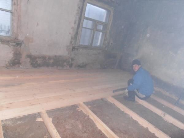 Работы начались с генеральной уборки. После вывоза всего мусора вскрыли старые полы. Пришлось полностью заменить прогнившие балки и настелить новые деревянные доски, что стало основой для будущего уюта.