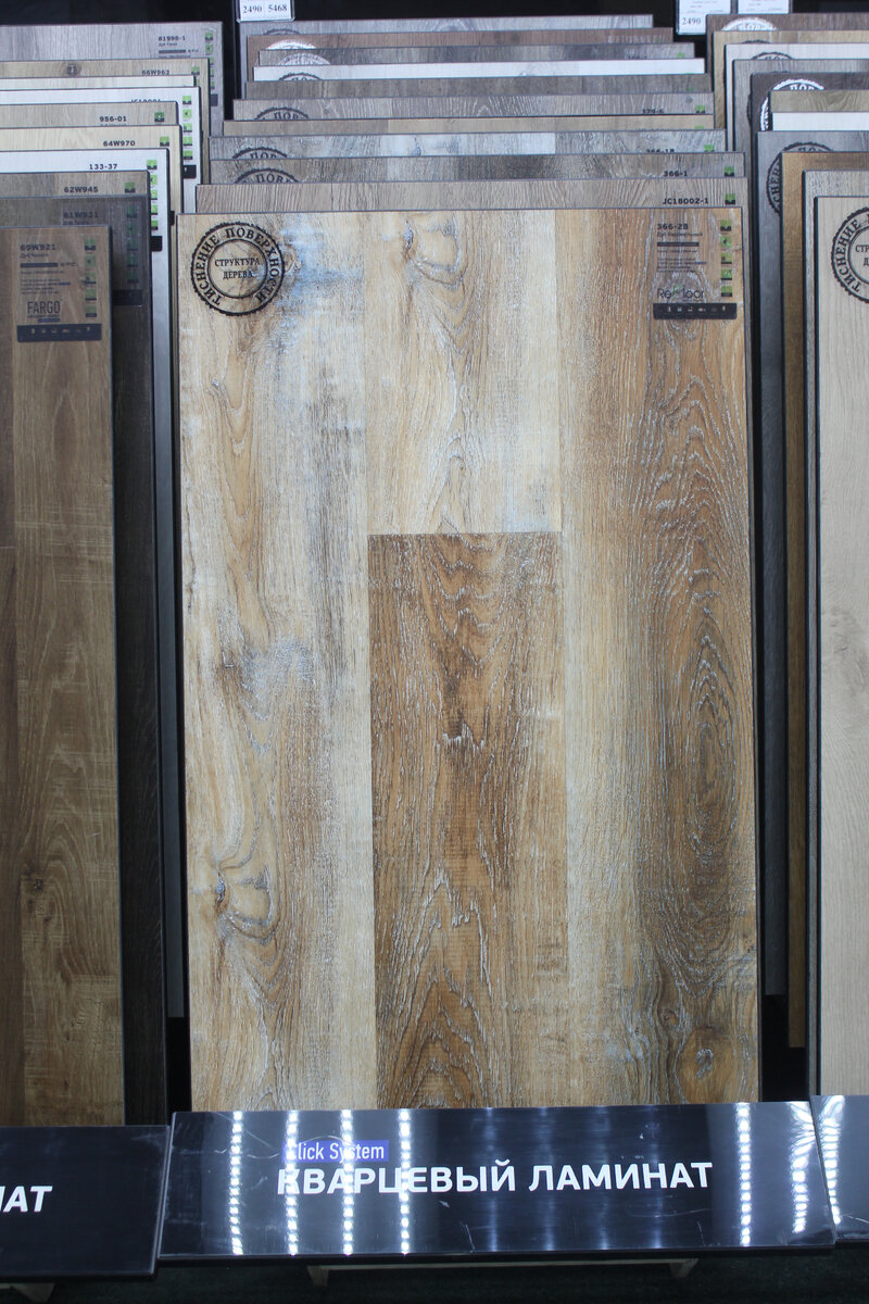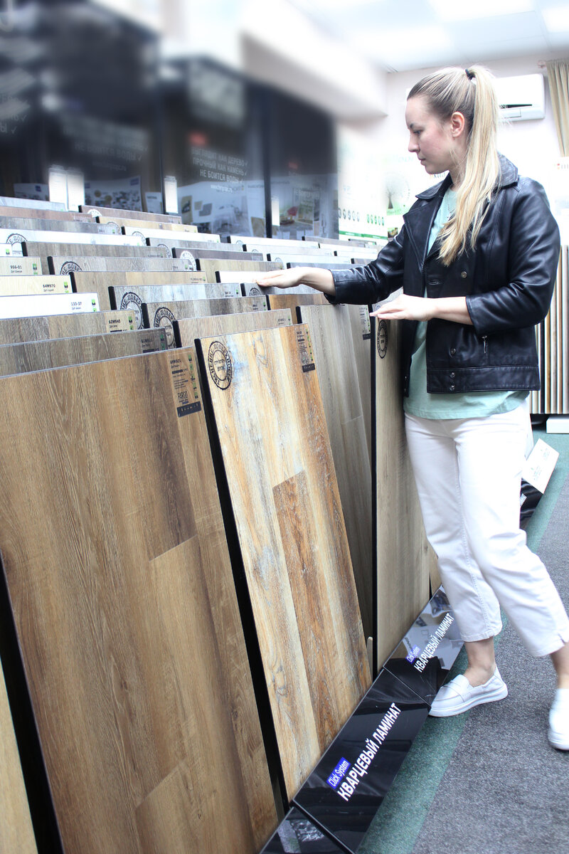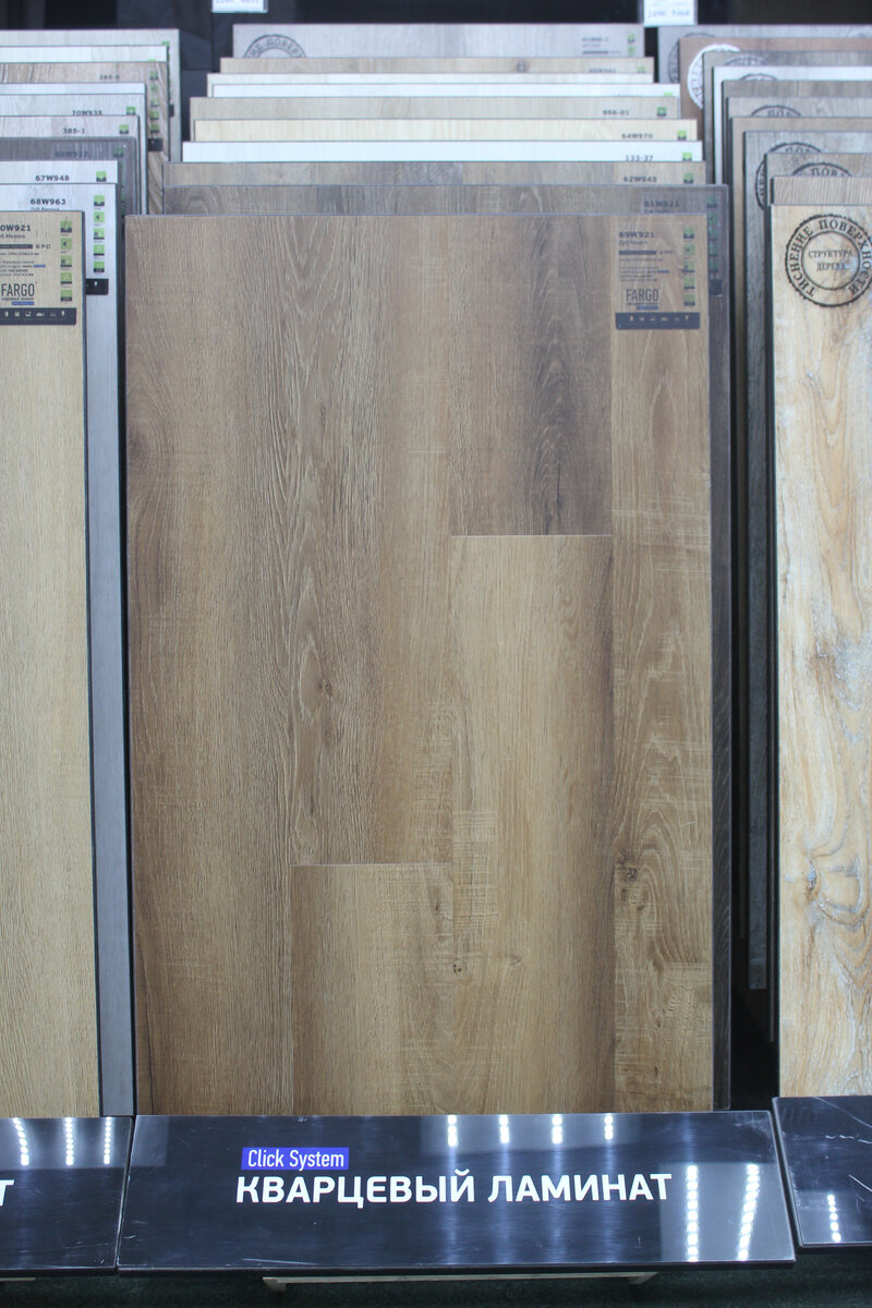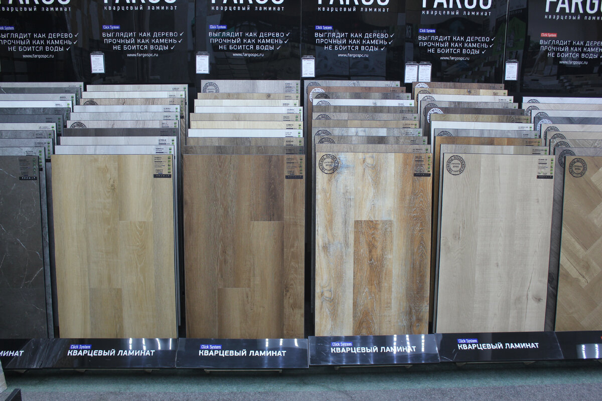 Мне захотелось увидеть кварцевый ламинат вживую, потрогать его и сравнить с привычными вариантами. В магазине меня встретило огромное количество коллекций, в основном имитирующих дерево, которые внешне очень похожи на качественный ламинат.