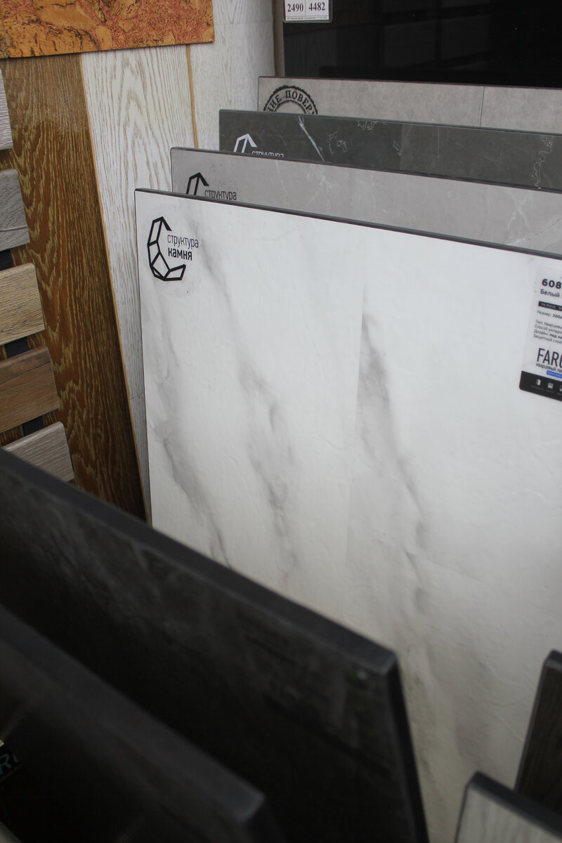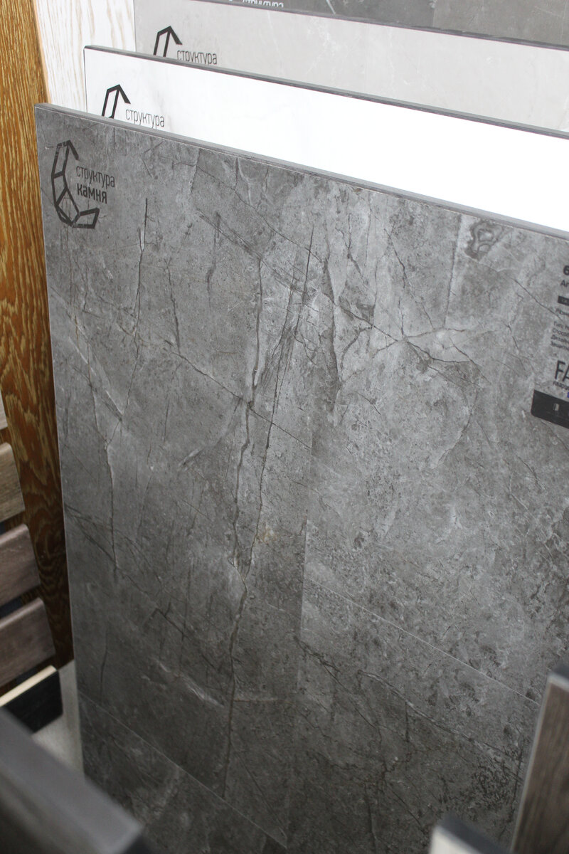 Но настоящий восторг у меня вызвали коллекции «под камень» и «под паркет». Каменные текстуры выглядят невероятно реалистично. В отличие от холодного и скользкого керамогранита, такой «мрамор» не скользит, совместим с тёплым полом, исключительно прочен и на 100% водостоек.