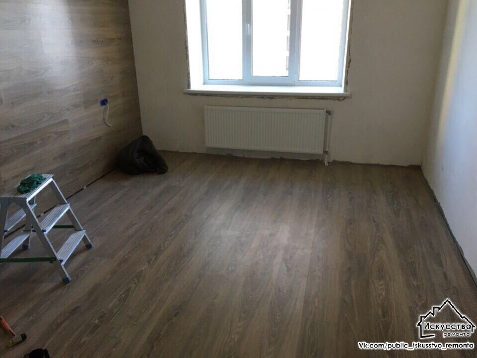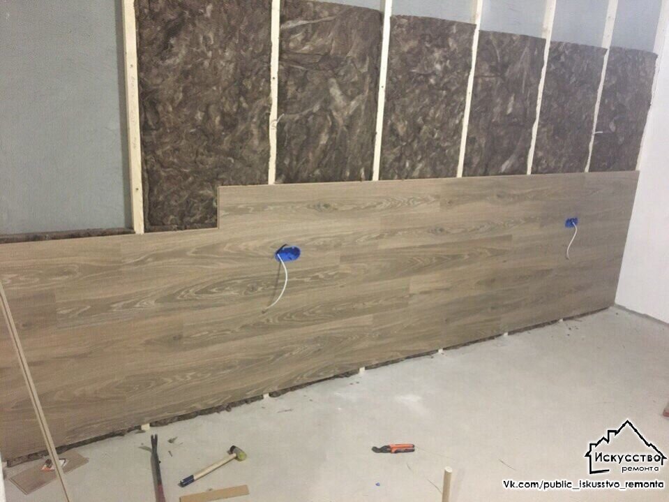 Бетонные стены были выровнены штукатуркой, после чего на них смонтировали обрешётку из деревянного бруса. В образовавшиеся ниши также уложили звукоизоляционные маты и развели проводку. И вот здесь автор ремонта решил отойти от стандартных решений. У него родилась оригинальная идея: использовать для декора одной из стен тот же ламинат, что и для напольного покрытия.