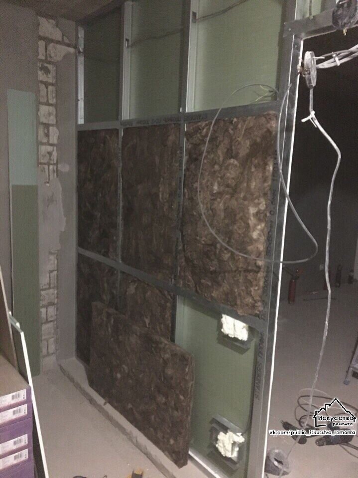 Новые перегородки собирались на каркасе из металлического профиля. Внутрь для эффективной звукоизоляции была заложена минеральная вата. На этом же этапе, что логично и удобно, внутри конструкций были проложены все необходимые электрические кабели – до обшивки гипсокартоном.
