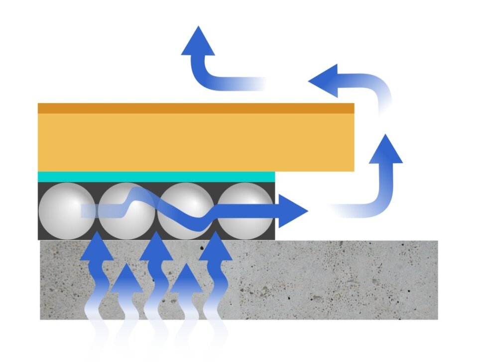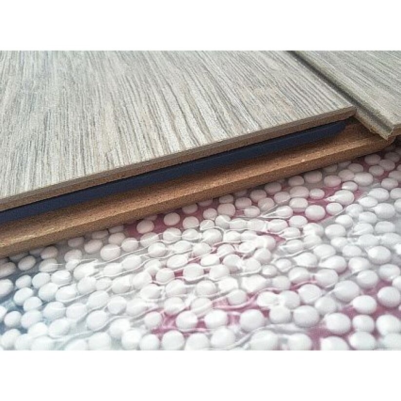 Нижний слой имеет вентиляционные каналы для вывода влаги за пределы помещения.Такая система обеспечивает постоянную циркуляцию воздуха, предотвращая появление плесени. Материал показывает отличные результаты в тестах на шумопоглощение (STC и IIC). Слой пенополистирола делает ходьбу по ламинату более комфортной, хотя по плотности и звукоизоляции он может уступать пробке.