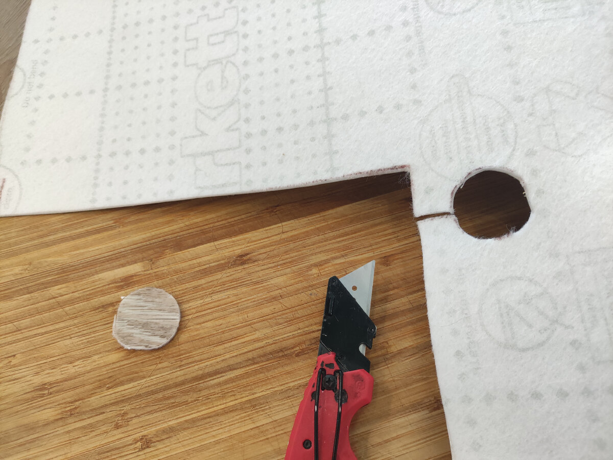 Получившийся шаблон с точным «отпечатком» формы переносится на расстеленный линолеум. Подложите под место реза что-то твёрдое (например, кухонную разделочную доску), чтобы не повредить покрытие под ним, и аккуратно вырежьте отмеченный участок.