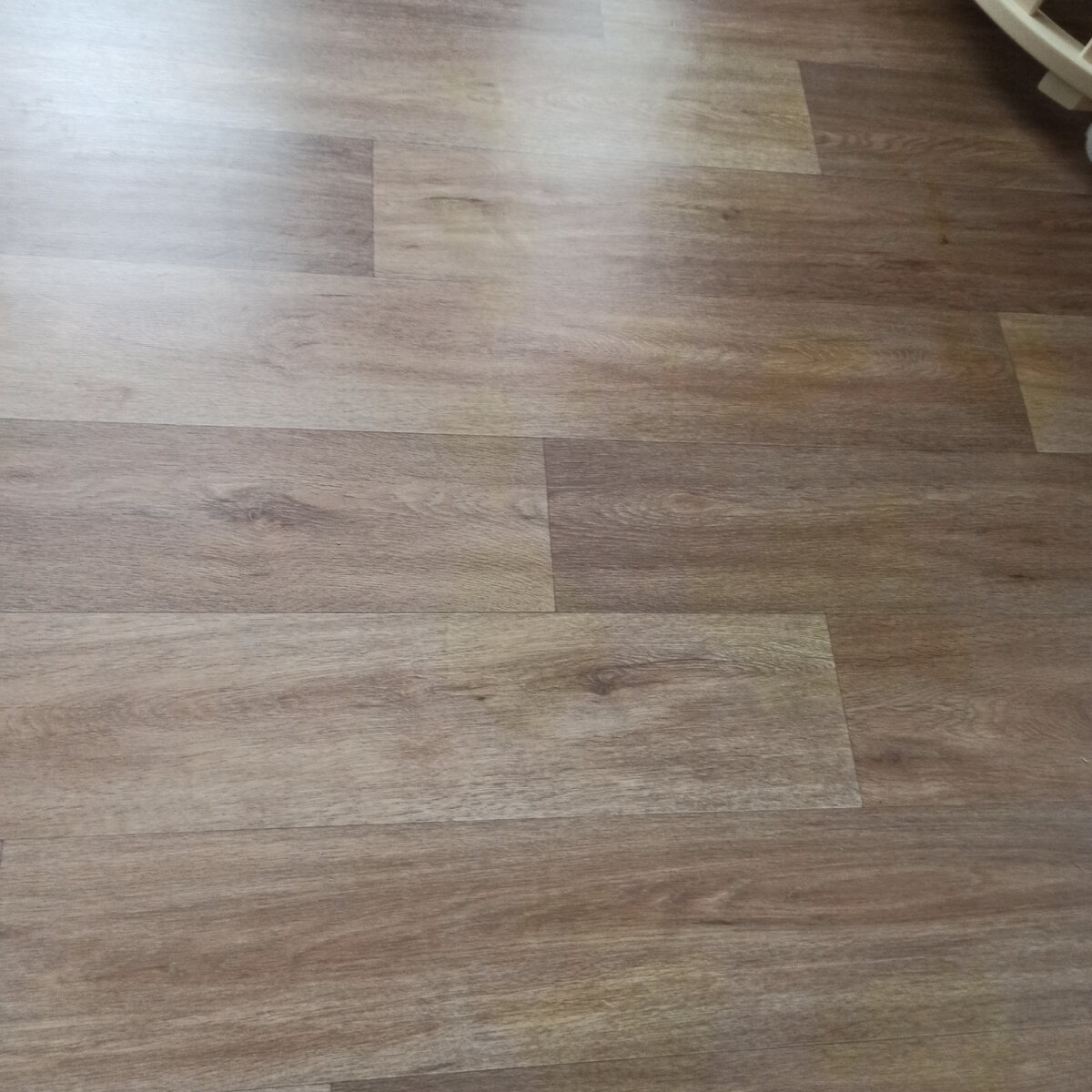 Однако вскоре произошло нечто непредвиденное: глянцевая поверхность линолеума начала менять цвет. Сначала это были едва заметные пятна, но со временем изменение цвета стало проявляться всё сильнее и распространилось по всей площади комнаты. Важно отметить, что комната очень солнечная, и покрытие долгое время находилось под воздействием прямых солнечных лучей.