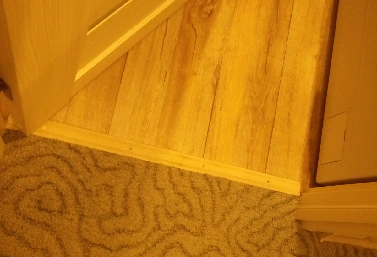 В дверных проемах и на стыках с другими напольными покрытиями (плиткой, ламинатом, ковролином) устанавливают декоративные порожки или переходные профили. Они не только маскируют перепад высот и стык, но и защищают края материала от задирания.