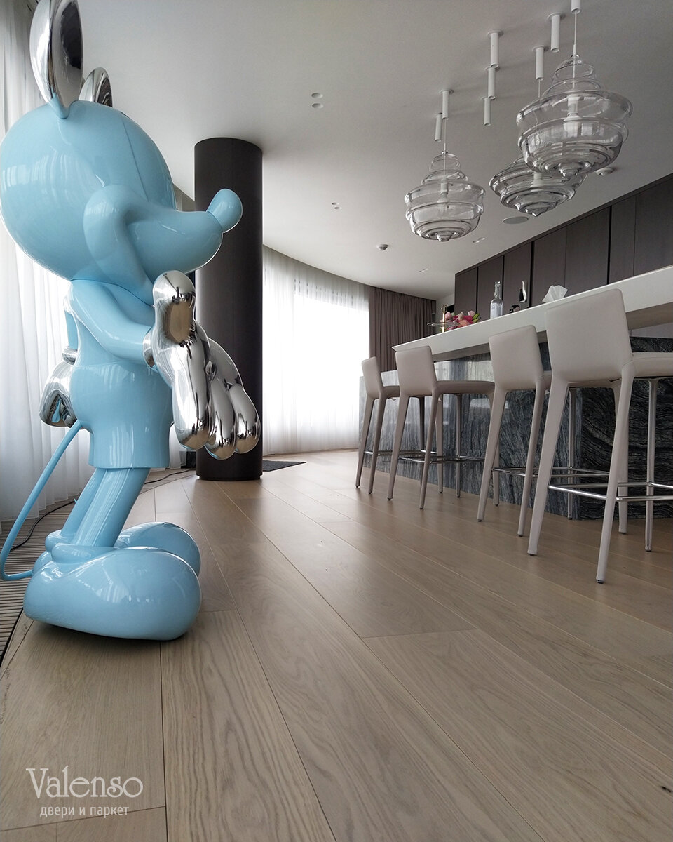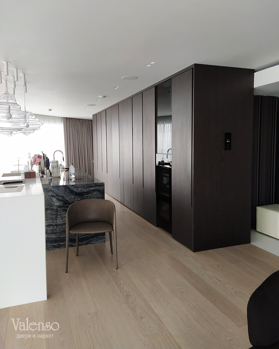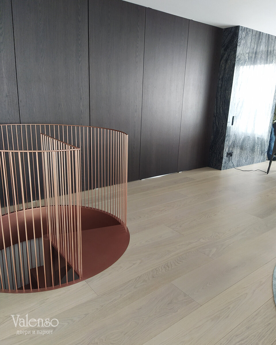 Для этого проекта был выбран паркет премиум-класса от известной итальянской фабрики Crespano Parchetti. Это не просто напольное покрытие, а произведение искусства, созданное из натурального дуба. Оттенок паркета был специально подобран в соответствии с утверждённым дизайн-проектом, чтобы идеально вписаться в общую цветовую гамму интерьера.